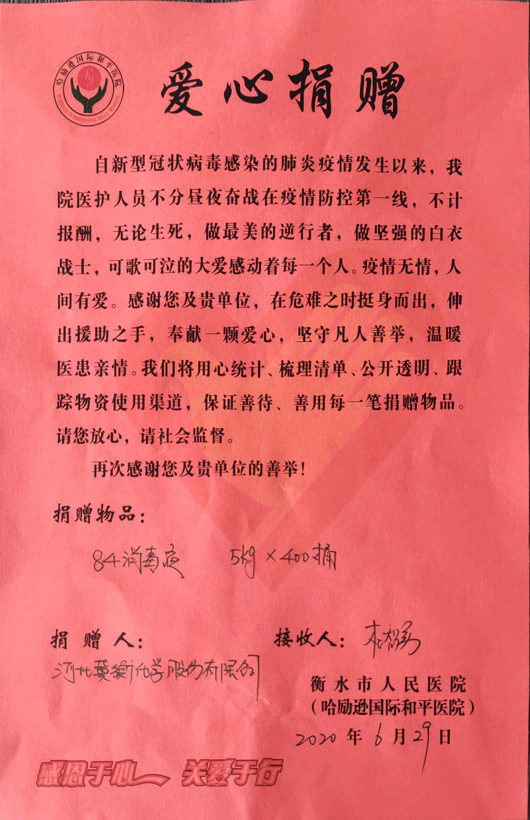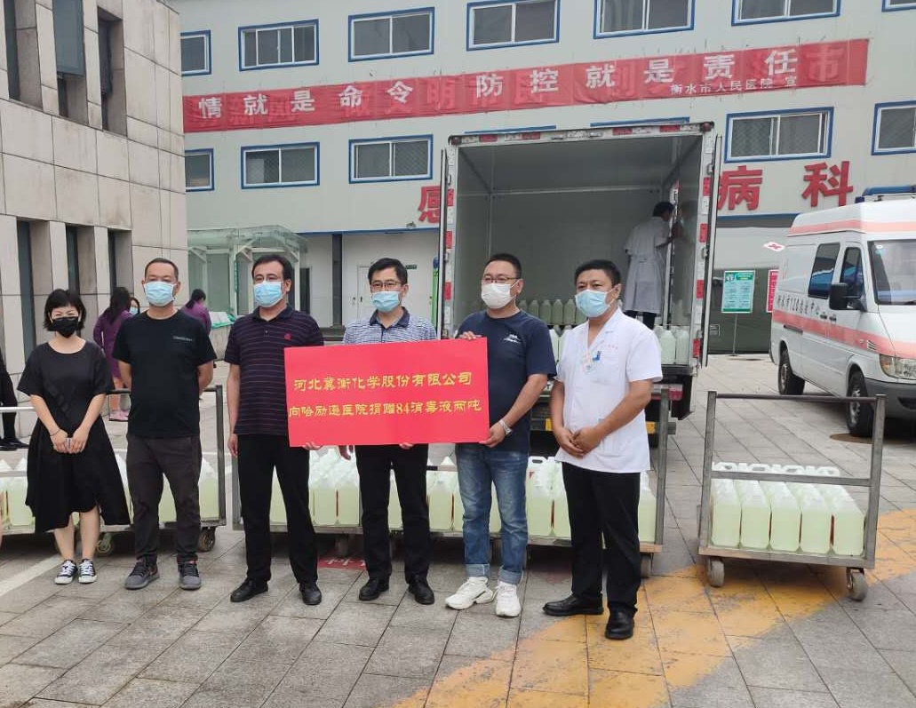 6月29日上午,公司宋英健副總經(jīng)理一行來(lái)到衡水市人民醫(yī)院,代表我公司向人民醫(yī)院捐贈(zèng)84消毒液兩噸,人民醫(yī)院有關(guān)領(lǐng)導(dǎo)接受了捐贈(zèng),并對(duì)我公司表示感謝。宋總表示,作為河北省防疫物資重點(diǎn)生產(chǎn)企業(yè),我公司將繼續(xù)關(guān)注疫情發(fā)展,繼續(xù)助力疫情防控,相信在全社會(huì)的共同努力下,我們一定能夠戰(zhàn)勝病毒,取得新冠病毒疫情阻擊戰(zhàn)的勝利。