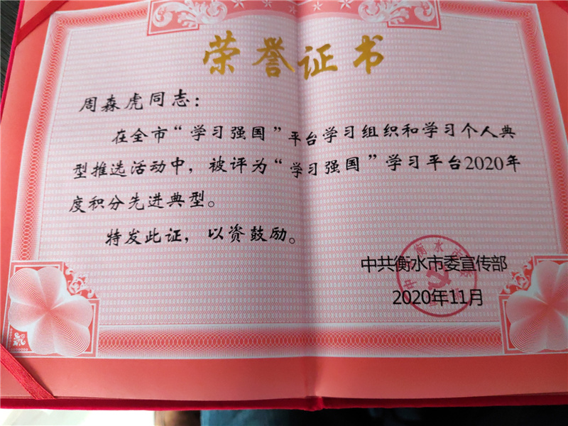 “‘學習強國’這個學習平臺,內(nèi)容權(quán)威、內(nèi)涵豐富、特色鮮明,我覺得受益匪淺,已經(jīng)‘上癮了’!”化學公司一車間副主任周森虎表示,從剛開始的閱讀文章、觀看視頻、答題到對平臺深入了解之后的上癮、依賴,現(xiàn)在“學習強國”已經(jīng)成了他每天的必修科目,到目前他個人累積學分已達到32864分,被衡水市委組織部授予“學習強國”學習平臺2020年度積分先進典型。